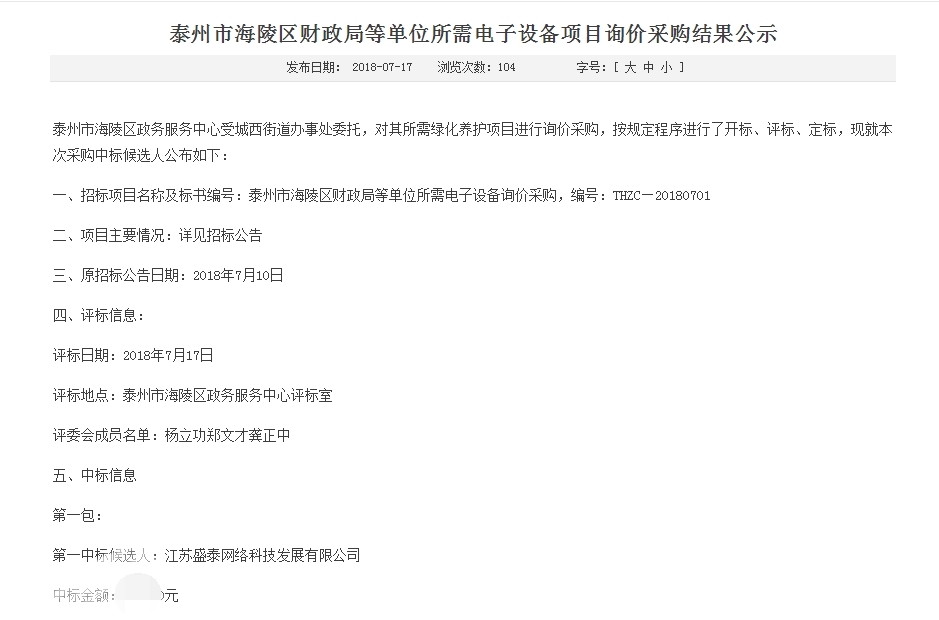 中標(biāo)喜訊--泰州市海陵區(qū)財(cái)政局電子設(shè)備采購(gòu)